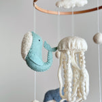 Introduce the magic of the ocean to your nursery with our Jellyfish Sea Life Baby Mobile. Featuring delicately handcrafted sea turtles, seahorses, whales, dolphins, and a graceful jellyfish at its center. This mobile brings the beauty of marine life to life. Each piece is thoughtfully designed to gently sway, creating a serene ambiance perfect for lulling your baby to sleep. * Material: Wood Frame, Cotton Thread, Wool Felt Decor