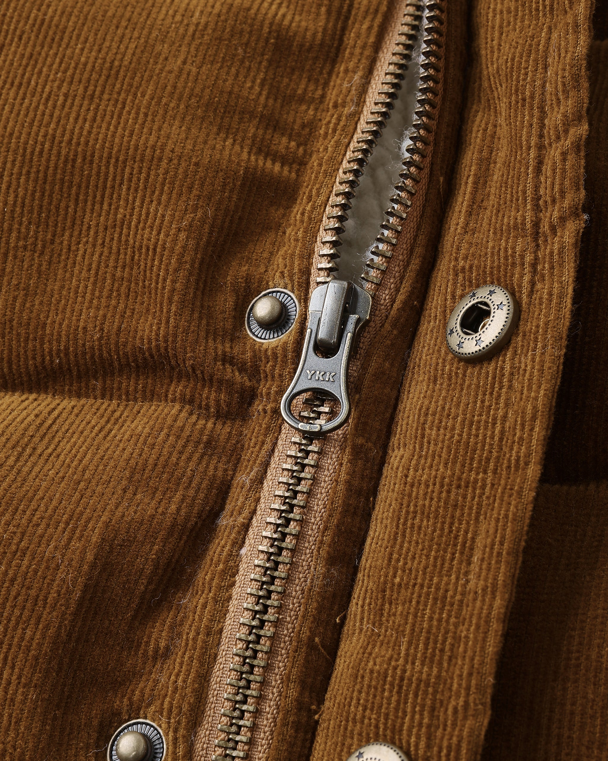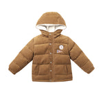 Your little one will stay classic and cozy in our Cord Puffer Jacket—embellished with cool front patches and designed with soft sherpa lining, a hidden front zipper with snap closure, and warm pockets.