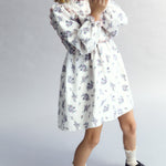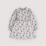 Short flannel floral print dress, fitted at the waist with a front ruffle detail. It features a ruffle finish with embroidery. It opens at the back with a tear and button closure.