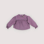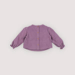 Micro-corduroy blouse featuring delicate tone-on-tone lace detailing at the front yokes for a soft, feminine touch. Designed with a back opening and wooden buttons for easy dressing and added charm. Pair with the matching trousers to complete a cozy, coordinated look. Perfect for everyday wear or special occasions.