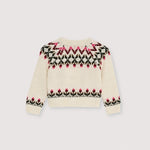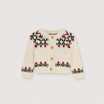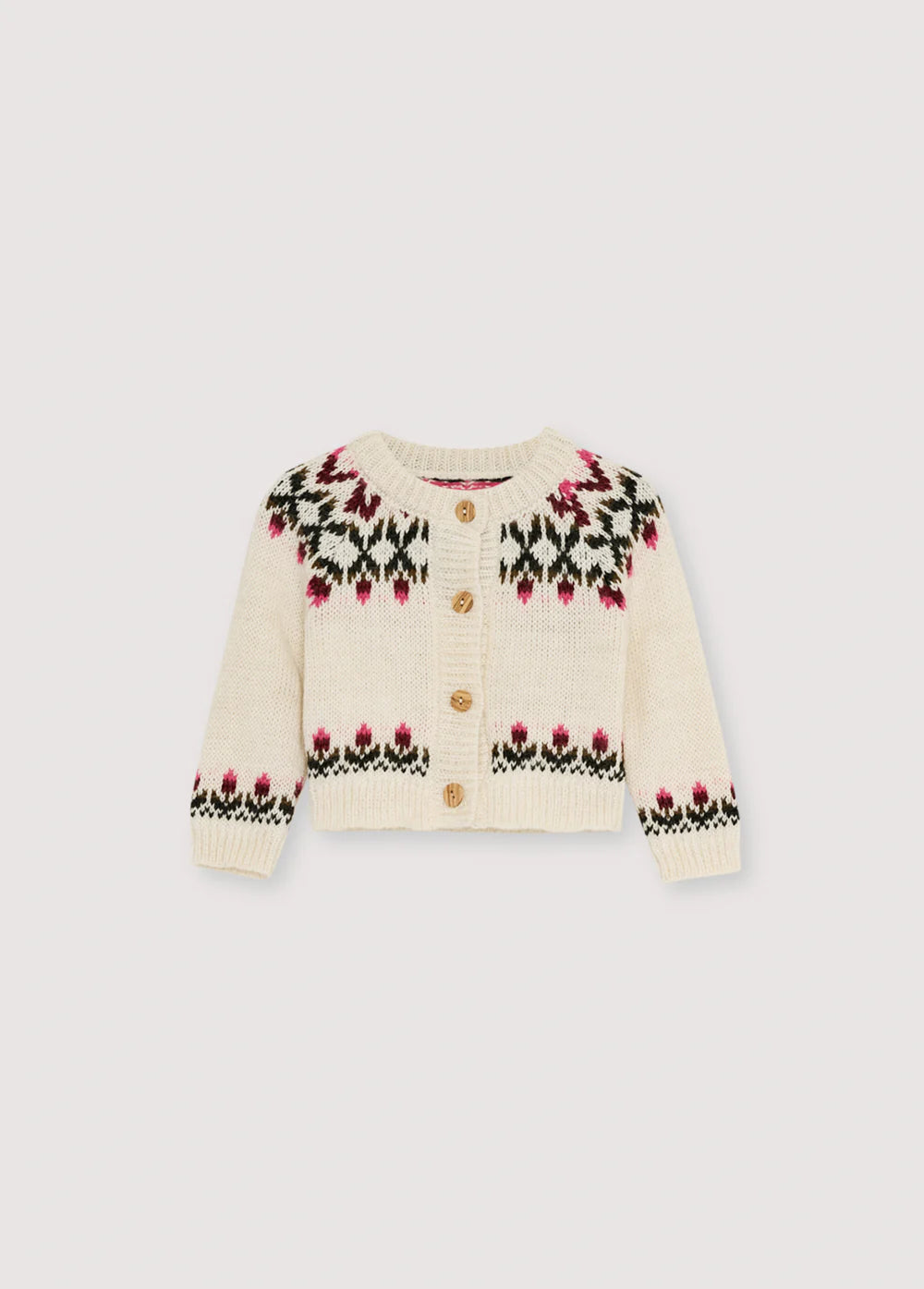A cozy cardigan crafted from a luxurious blend of alpaca and wool, featuring a front opening with wooden buttons and an intricate floral jacquard design across the front, back, and sleeves. Pairs perfectly with the matching pants for a complete, elegant look.