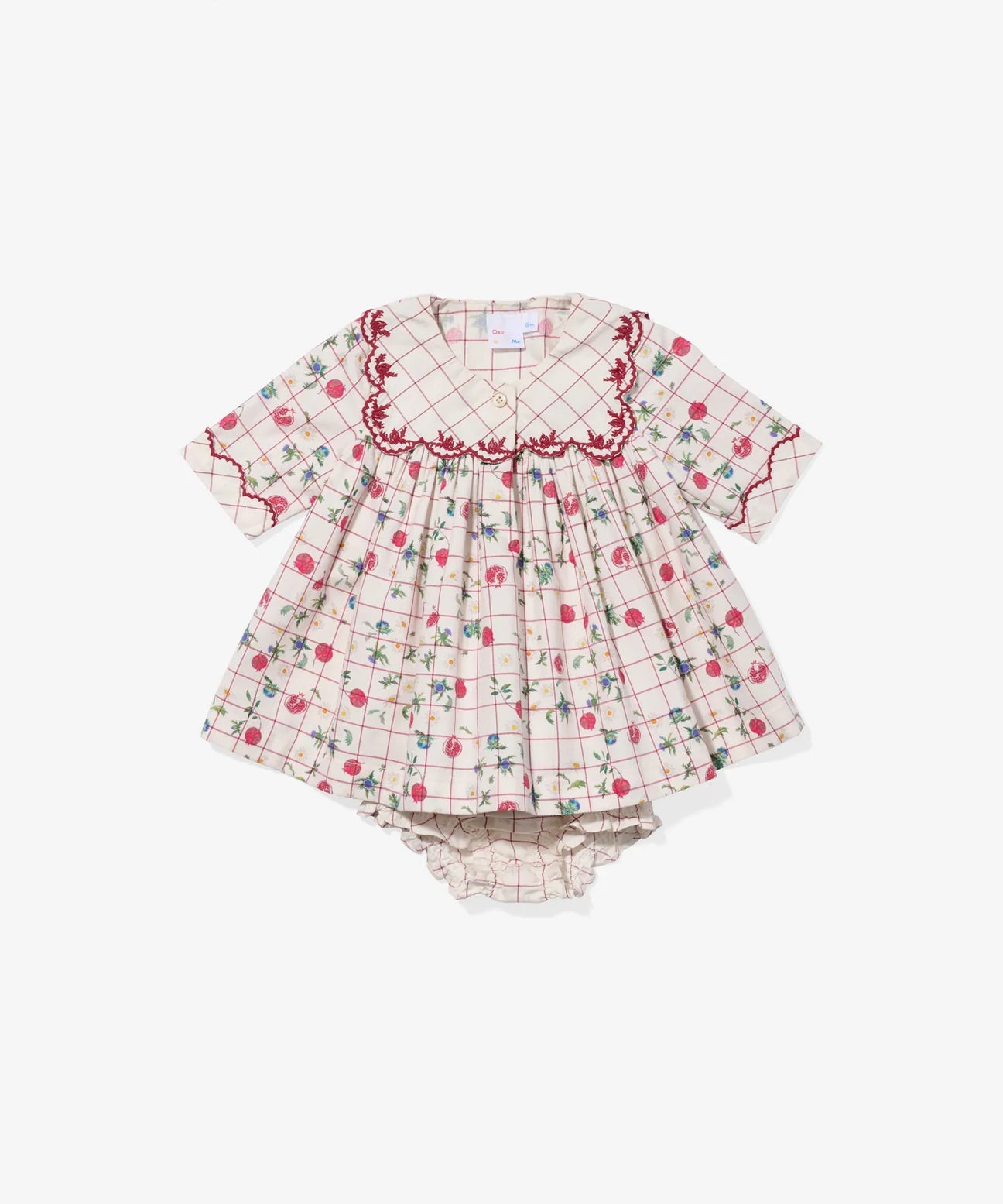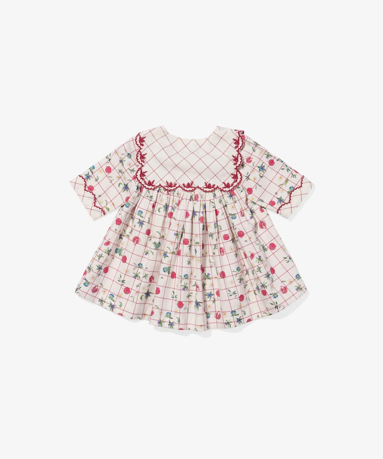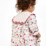 A limited edition, occasion-worthy dress for the season of fresh beginnings. Featuring our first ever pomegranate print—set against timeless plaid and complete with wildflowers—this dress is perfect for everything from school to special occasions. Designed with a scalloped, sailor collar threaded with thistle embroidery, it is full of sweet and whimsical details you are sure to delight in.