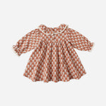 Our Callie Dress features crochet trim, a darling collar, smocked front bodice, gathered skirt, and ruffle sleeves, with buttons at the back for easy dressing. Matching bloomers included with all sizes.