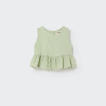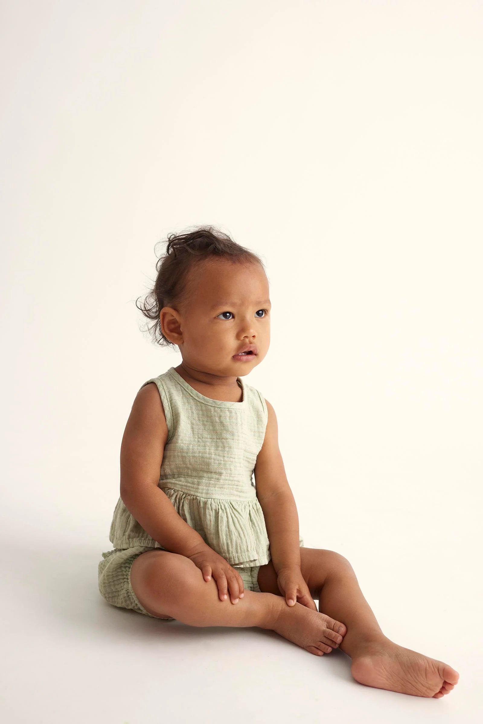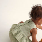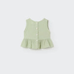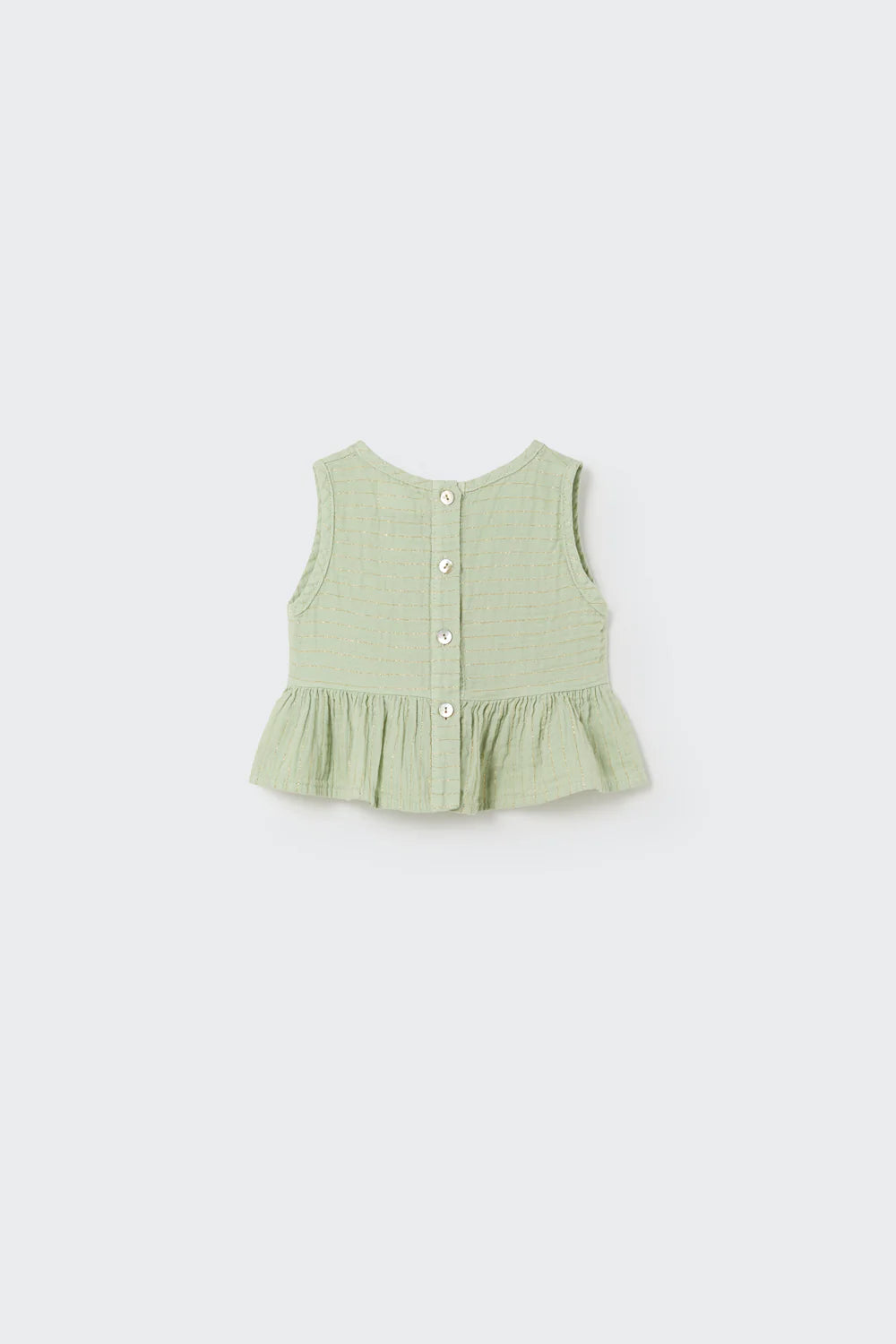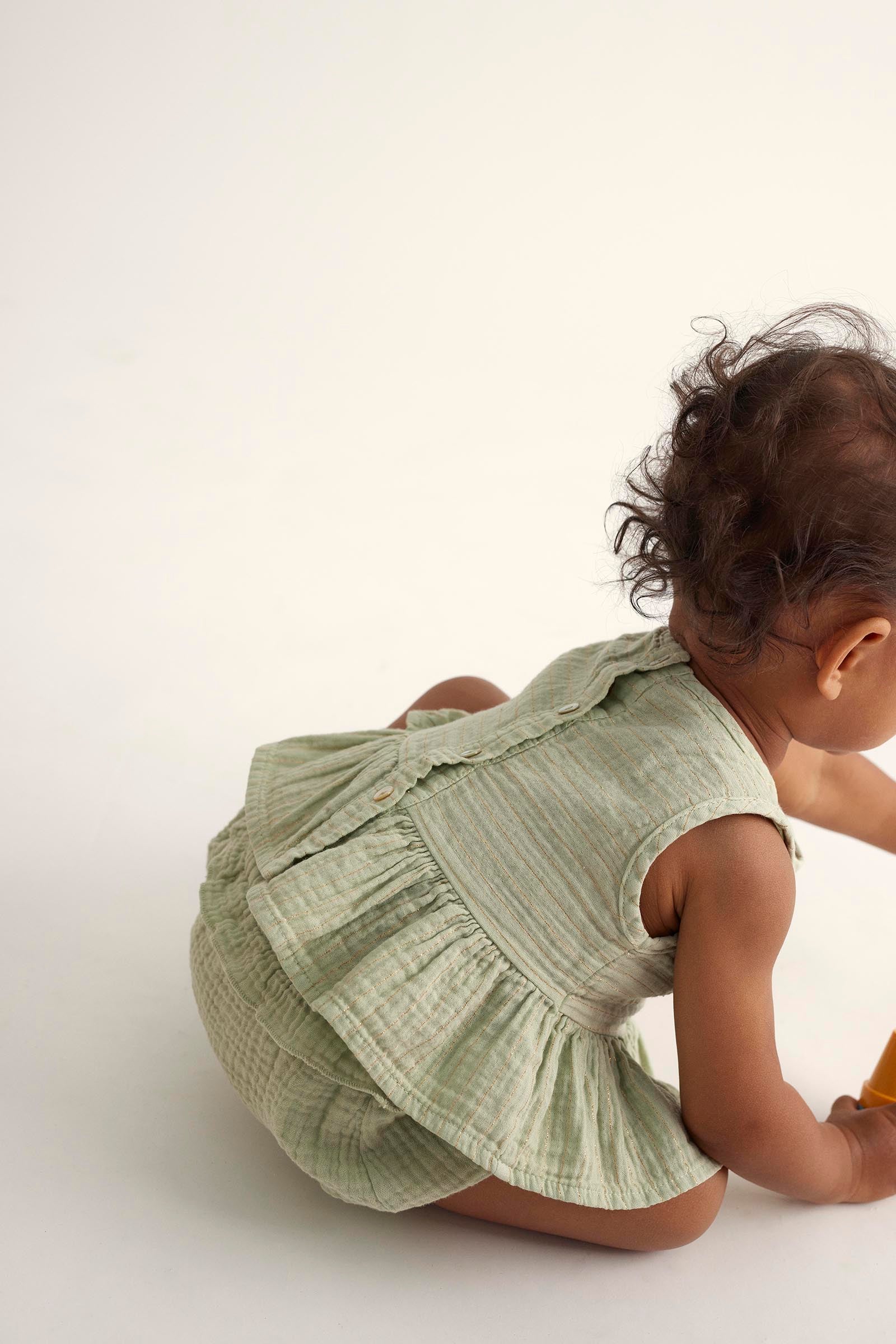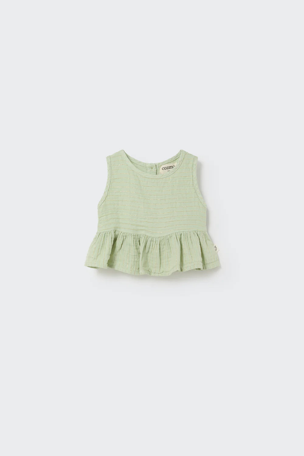 Say hello to effortless cuteness with our Lurex Gauze Baby Top! Made from soft and lightweight cotton gauze, this charming striped top is perfect for your little one’s sunny adventures. Featuring a sweet round neckline, button closure at the back, and adorable ruffle trim at the hem, it’s designed to keep your baby comfy while shining bright in playful golden lurex stripes. Whether it's playtime at the park or family gatherings, this sleeveless delight adds just the right touch of flair. Dress them up or keep it casual—either way, you’ll be capturing all those precious moments with a smile. Part of our delightful gauze clothing collection by Cozmo, this top is bound to become a favorite in their wardrobe! Perfect for infants through toddlers.