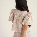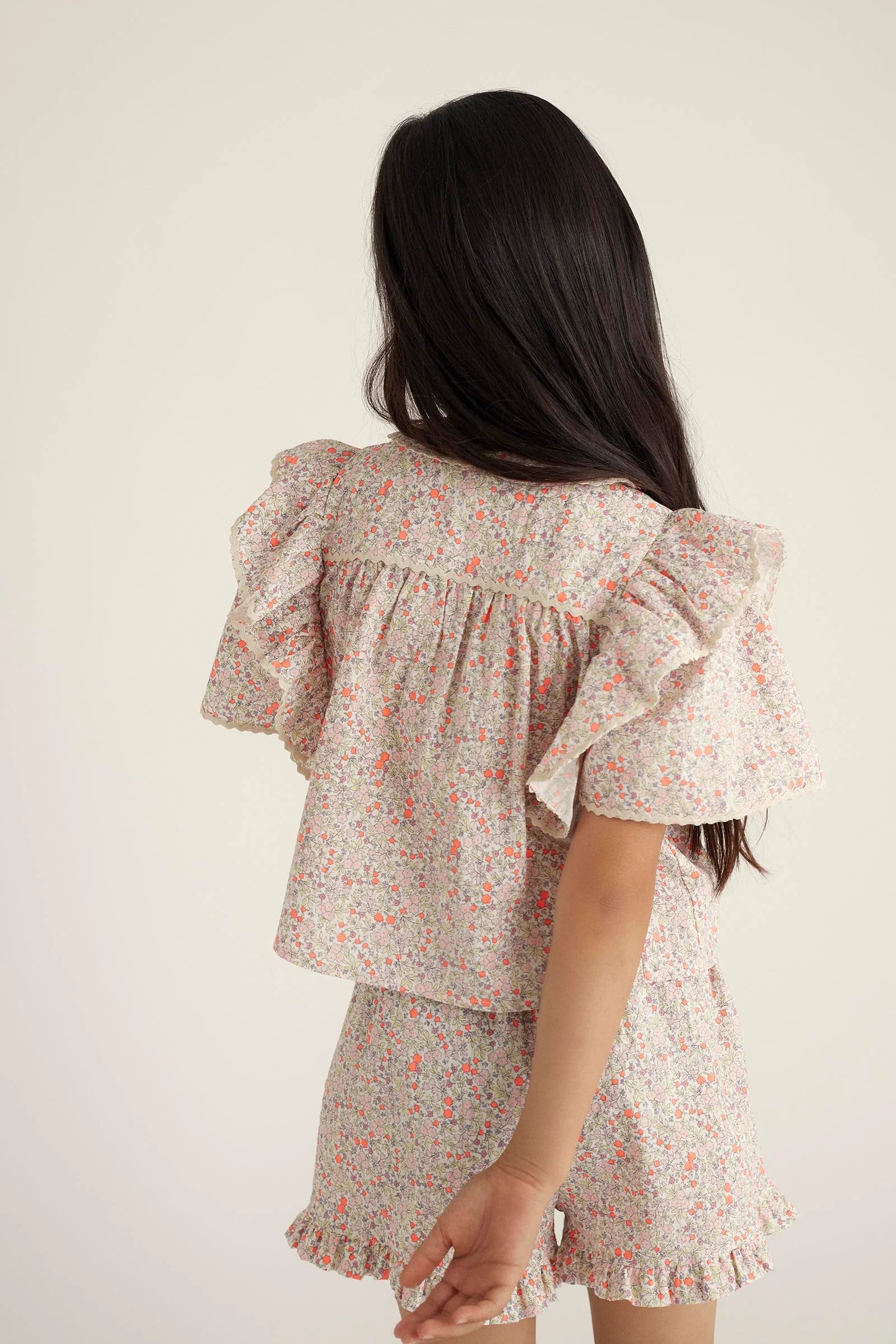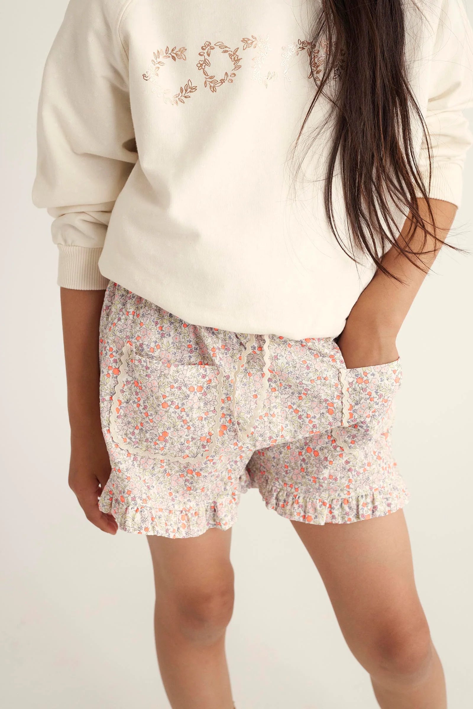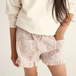 Playtime just got a whole lot cuter with our Organic Floral Shorts for girls! Made from the softest, light-as-a-cloud organic cotton, these shorts are perfect for twirling and giggling all day long. They feature a rainbow of bright flowers that dance across the fabric, making every step feel like a happy parade! With an elasticized waistband and adorable drawstring to keep everything snug as a bug, your little sunshine will be ready for any adventure – from picnics in the park to silly snack times at home! Plus, those patch pockets (with super-fun onduline ribbons!) can carry treasures galore. And let's not forget the ruffled trims that add just the right touch of pizzazz! Pair them with our matching shirt for a polished look that's still playful—or let her mix it up for everyday fun!