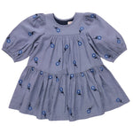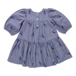 Delicate Flowers! A scattering of sweet daisies bloom from a classic chambray ground in the Blue Blossom Embroidery shown here on the Girls Fiona Dress. Design highlights include elastic puff sleeve, and silver glitter buttons at the back. Pair super swingy silhouette with a bobby sock and a mary jane show for a classically elevated look. Match back to Little Sis in the Baby Girls Rowan Bubble.