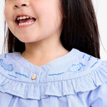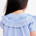 A summery ruffle collar shirt from the limited edition Go Fish! collection. Made from breezy organic cotton with tonal blue fish embroidery detailing at the collar and signature button front closure.