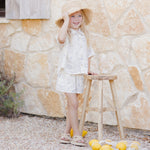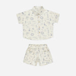 Our light and flowy Kelli Set features a button-down shirt with a drop shoulder and wide-leg shorts with an elastic waistband.