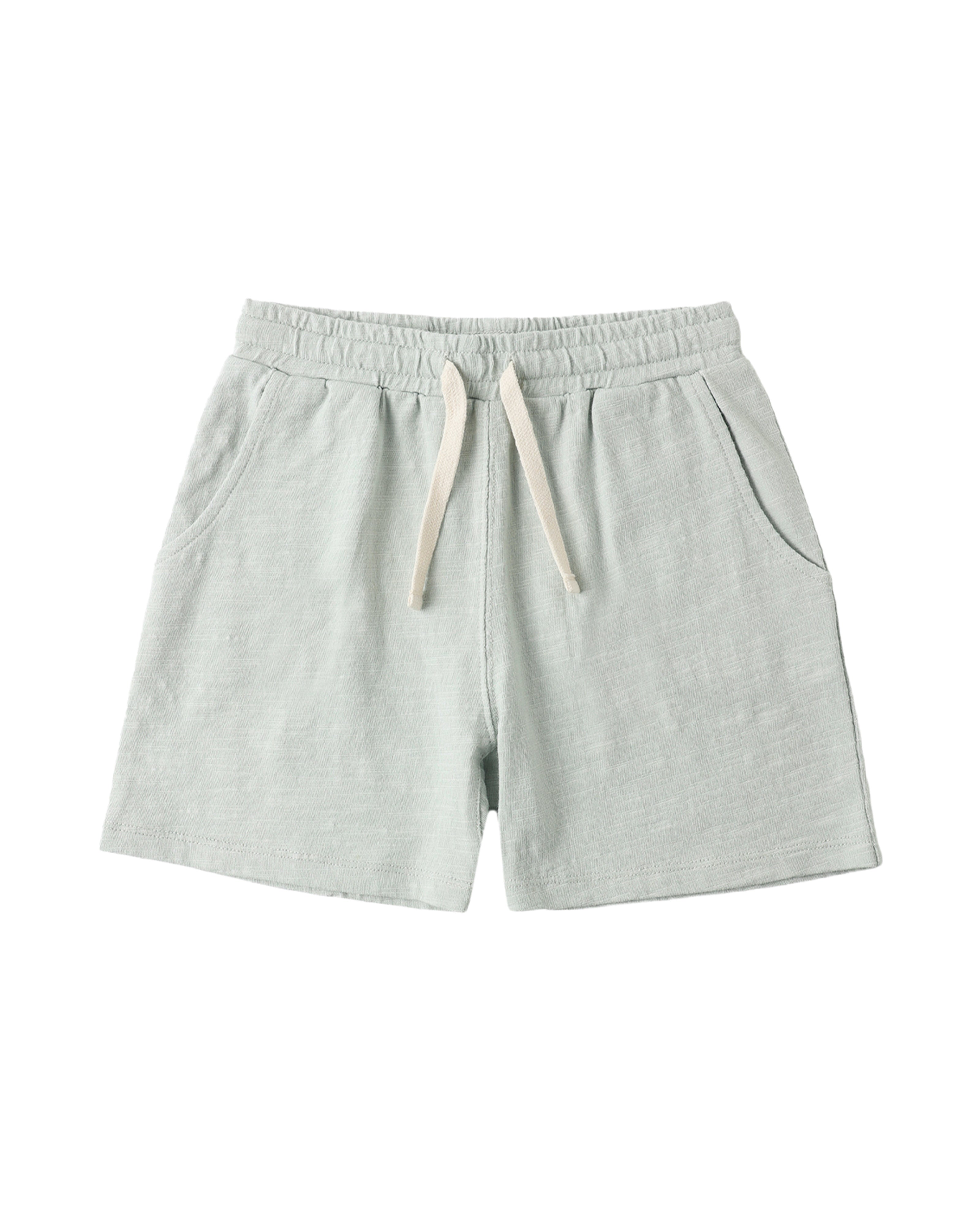 Rylee + Cru's Sam Short  in Seafoam is a durable and comfortable summer kids short with a drawstring waistband, in a deep greenish blue color.