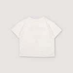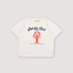 Short-sleeved T-shirt with contrast detailing on the collar and sleeves, featuring a playful red lobster print and blue lettering on a crisp coconut background. Designed to capture summer vibes, this fun and versatile piece is perfect for casual outings or beach days, adding a touch of whimsy to your seasonal wardrobe.